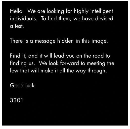 At first, it really looks like a decoy that doesn’t make any sense. But look at the image again. There are two words, Guess and Out. When users tried out an application “Outguess”, they were able to decipher a coded message from the first image (not the duck) that led towards a book, then leading the users to a phone number: (214) 390-9608, which had a pre-recorded message: “Very good, you have done well. There are three prime numbers associated with the original final.jpg image. 3301 is one of them. You will have to find the other two. Multiply all the three numbers together and add a .com on the end to find the next step. Good luck. Goodbye.”